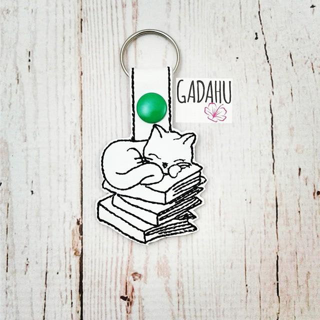 This is an Instant Download Embroidery Digital File "Cat Sleeping on Books Snap Tab Key Fob ITH Embroidery design file" Snap Tab Embroidery Design 4X4 size.