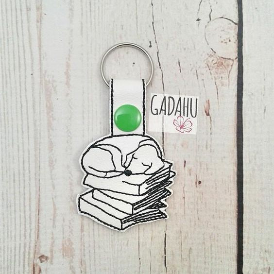 This is an Instant Download Embroidery Digital File "Dog Sleeping on Books Snap Tab Key Fob ITH Embroidery design file"